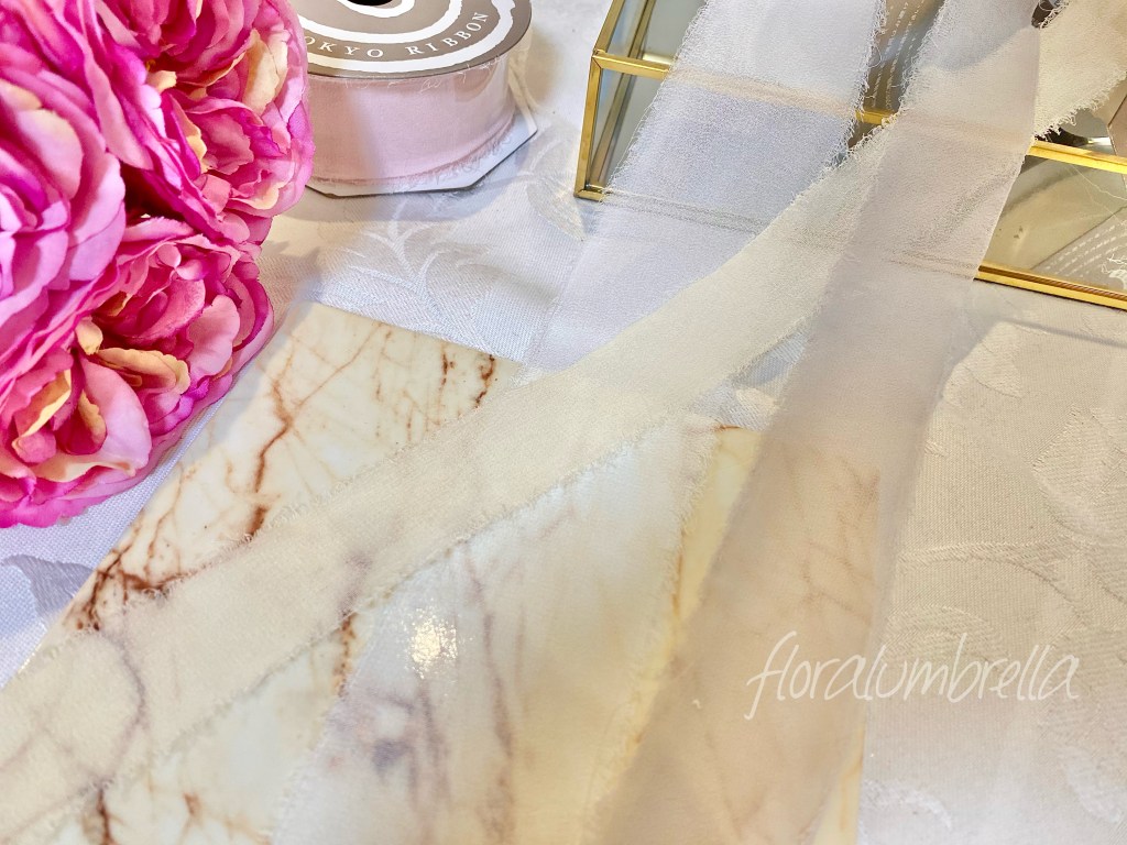 1、2枚目はTOKYO RIBBONさんのフレッジシフォンシリーズ。 このリボン本当に可愛い♡ フローリストさんでもお使いの方も多いかと思います。 サイドのフリッジが可愛すぎるポイント。 太さも選べますし、お色もグレイッシュだったりして合わせやすい。 好みの色が多すぎてどの色が一番好きかは選べません。 ちなみに1枚目は、アイボリー・スノー・フロスティグレー 2枚目は、アッシュローズ・ピーチベージュ 私は自身の結婚式のブーケのリボンとしても使いました。 そういえば3枚の画像のリボン、お気に入りなだけあって、すべて自身の結婚式で使っていました♩ そして3枚目は、MOKUBAのリボン。 私は勝手にハシゴと呼んでいます(笑) レースのような真っ白のデザイン性のあるリボンも一目惚れしてしまいます。 こんな感じで使いましたよ♡