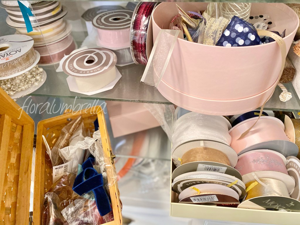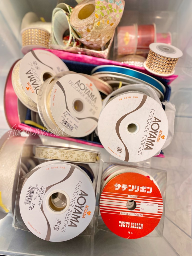 こんばんは。 突然ですが、皆様リボンはお好きですか? 私は大好きです♡ ブーケの結束に結わくリボンだったり、ラッピングとして使ったり、 作品をよりよく見せてくれたりもするリボン。 フラワーアレンジメントを仕上げるのに欠かせないアイテムです。 私も、ちょこちょこリボンを集め、今では割と色々なリボンを持っています。 今日は私が持っているリボンから、最近のお気に入りとfloralumbrella流! リボンの収納をご紹介しようと思います♡ (floralumbrella流ってほどでもないですが…) まず、最近のお気に入りリボンはコチラ!