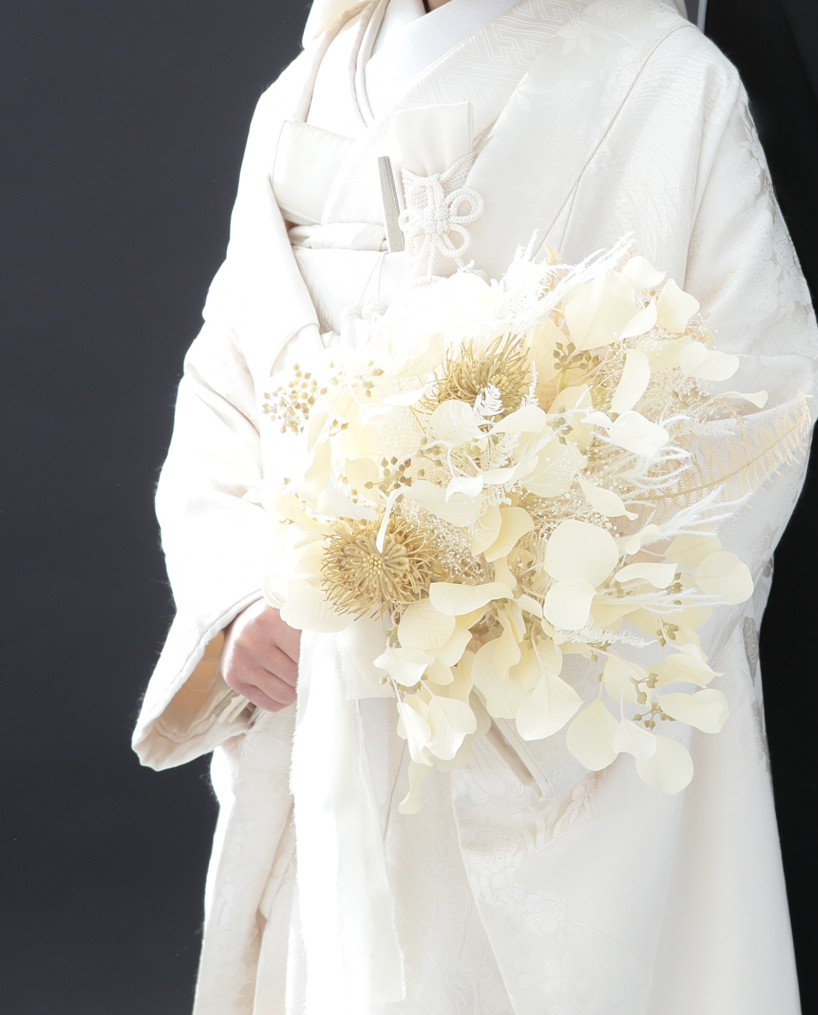 アーティフィシャルフラワー・プリザーブドフラワー・生花での (前撮り)ブーケや花冠、ブートニア、和装ブーケ、ボールブーケ。