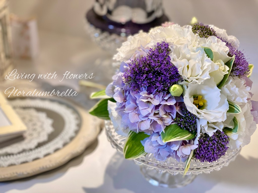 食卓の真ん中に飾ると可愛いまん丸のアレンジメント。 こういった半円級形の360度展開のアレンジメントのことをドームアレンジメントといいます。