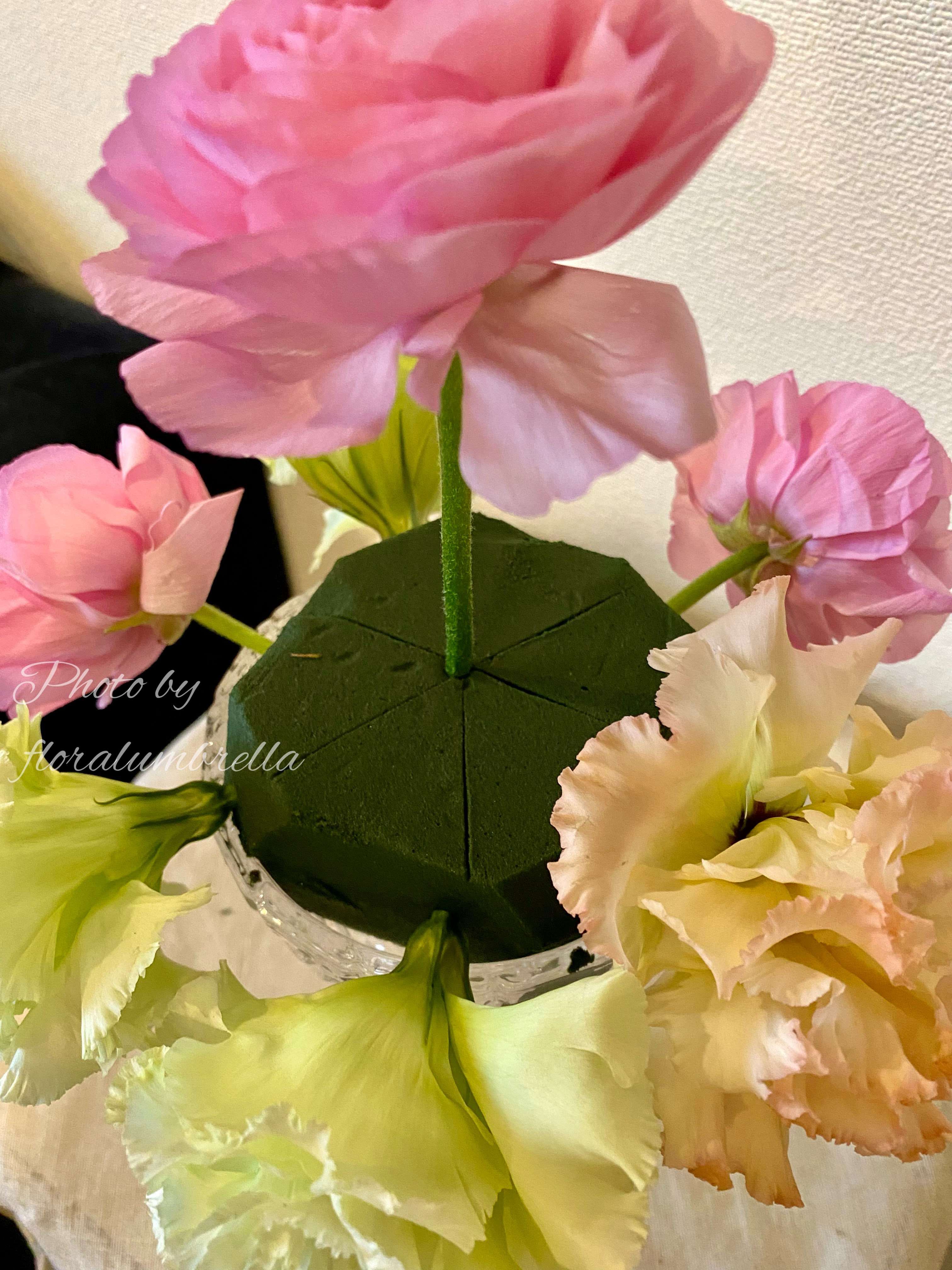 簡単そうに見えるアレンジメントですが、意外とまん丸に作るのは難しいです。 そんなドームアレンジメントを綺麗に作るには、いくつかポイントがあります。 まず、美しく見える比率で半円級のアウトラインをしっかりとってあげることがポイントになります。 どんな作品を作るにもアウトラインは大事ですよね。 枠組みがしっかりしていると、その先が作りやすくなります。 ドーム型の場合は、下の写真のように底辺を6等分に分けて花を挿します。 対になる反対側のお花と同じ長さになるように入れてあげてください。 慣れるまでは定規で測ってあげるといいですよ。
