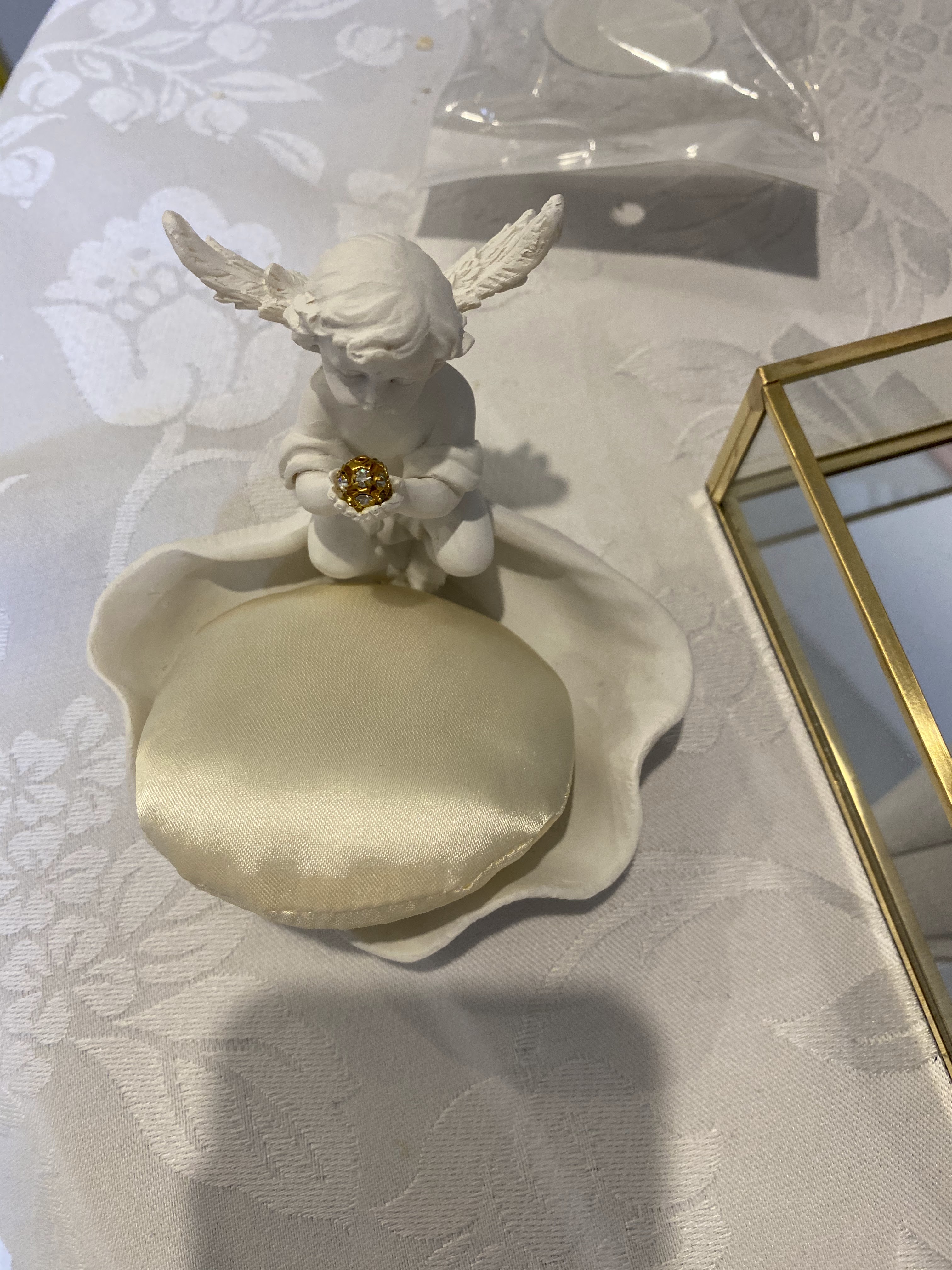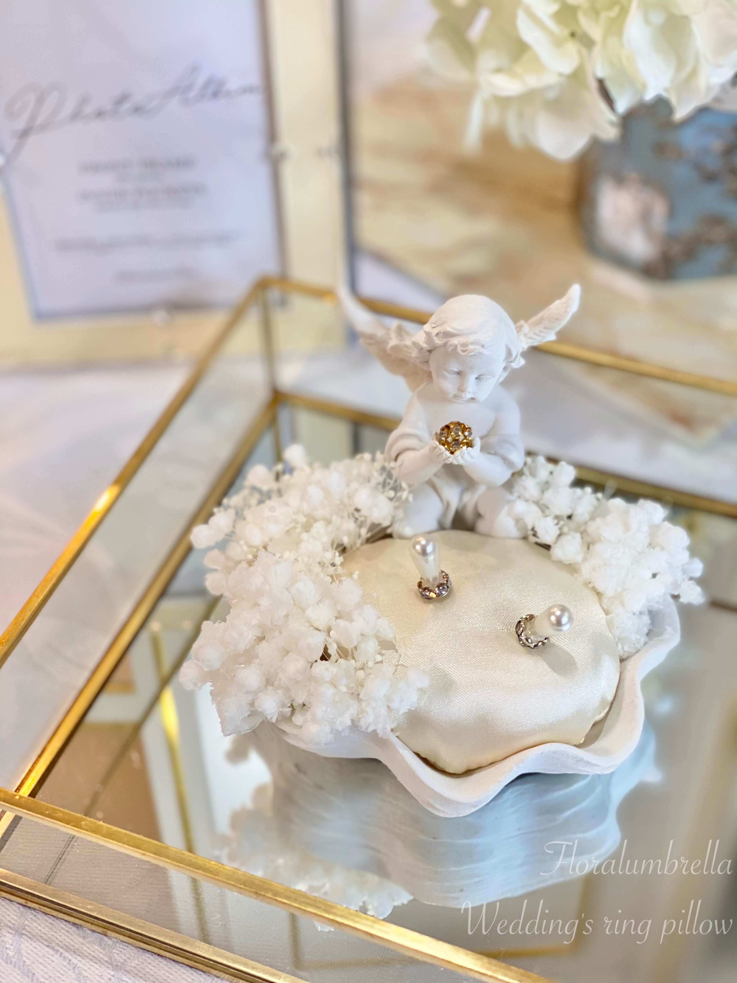 私は、このエンジェルのポットシェルが気に入っていたので、この子にちょうどいいサイズのリングピロー用のクッションを用意しました。 クッションの間には、カスミソウのプリザーブドフラワーを添えています。 カスミソウは小さな塊で6つくらワイヤリングしてあげて、クッションの間に入れ込んでいますよ。 私は真っ白のカスミソウにしましたが、カラードレスや結婚式のテーマカラーに合わせて、色を取り入れてあげても良いと思います。 そして指輪を掛ける部分も必要で、リボンやパールでもいいと思いますが、私はキラッとしたピンを使いました。これは、新郎のブートニアなどを胸に付けるコサージピンです。 どれも仕入れをしている四谷三丁目の東京堂で購入しています。 インテリア雑貨としても可愛いので、結婚式が終わってからもずっと使えるのがやっぱり好みのデザインで作ってよかったことだと思います。 プレ花嫁の皆様、記念と思い出に残るリングピロー作りを是非されてみてくださいね♡