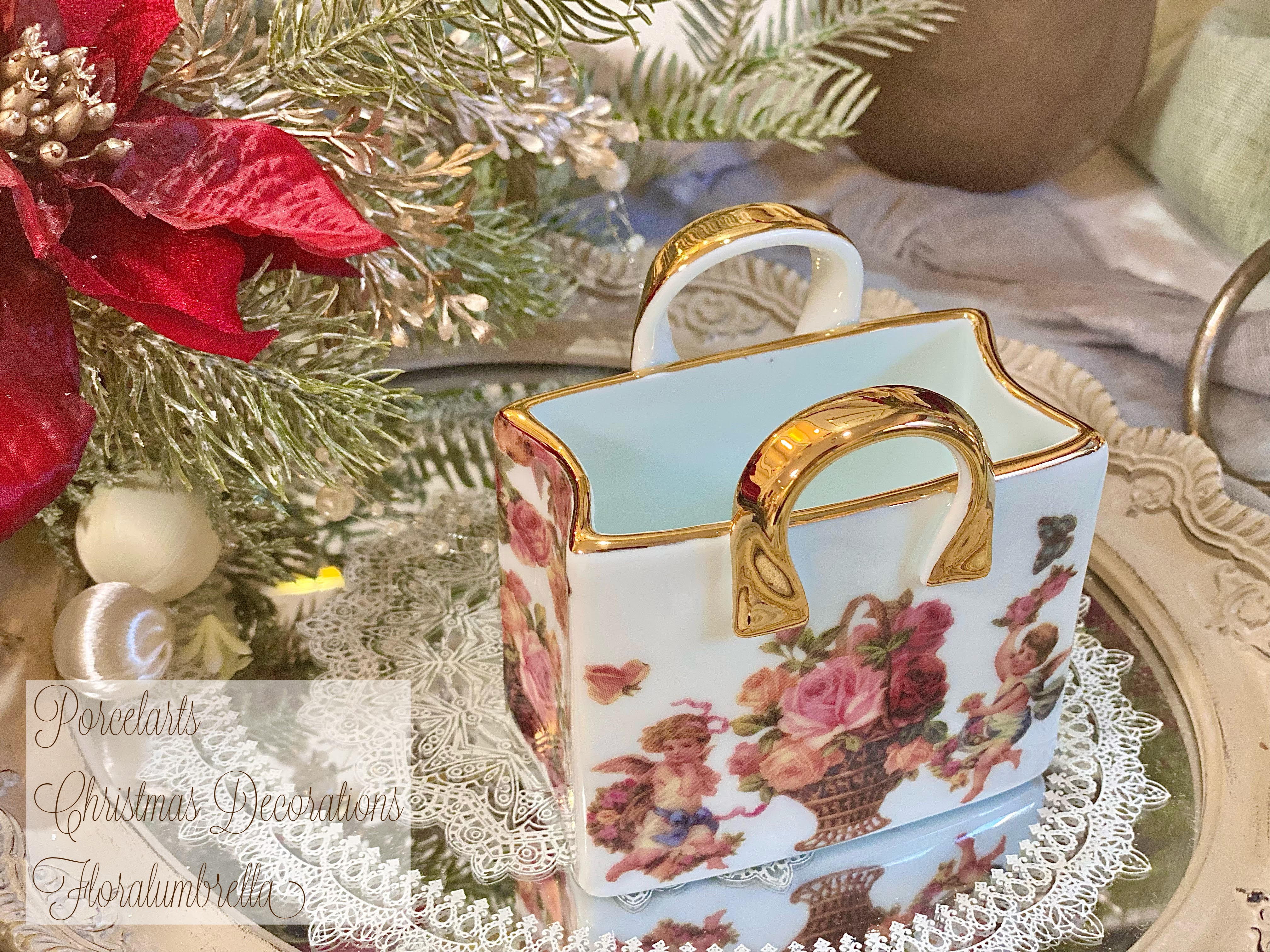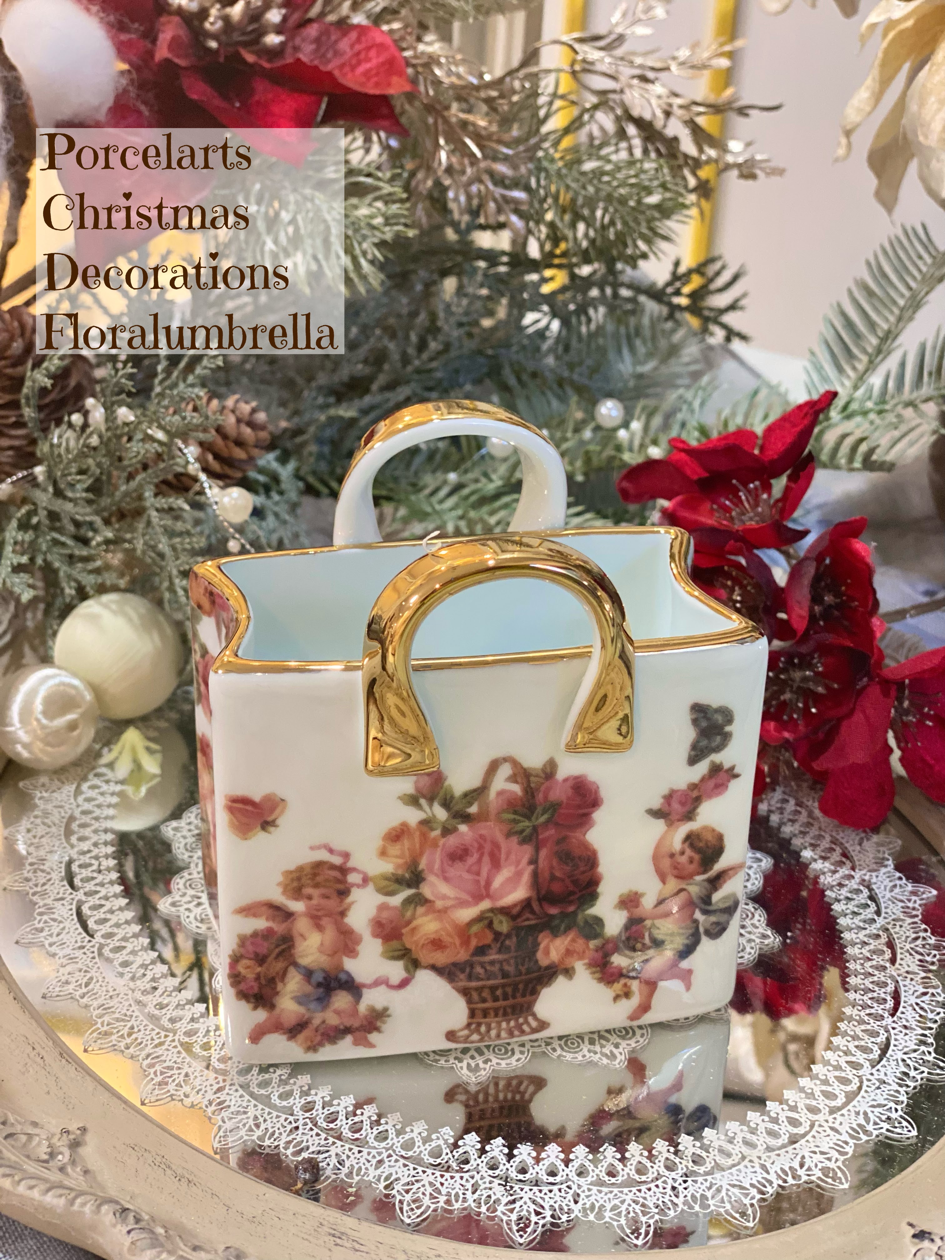 ワンちゃん抱えたサンタさんが可愛すぎる♡ ポーセラーツ作品はバッグ型の白磁を使ったものと