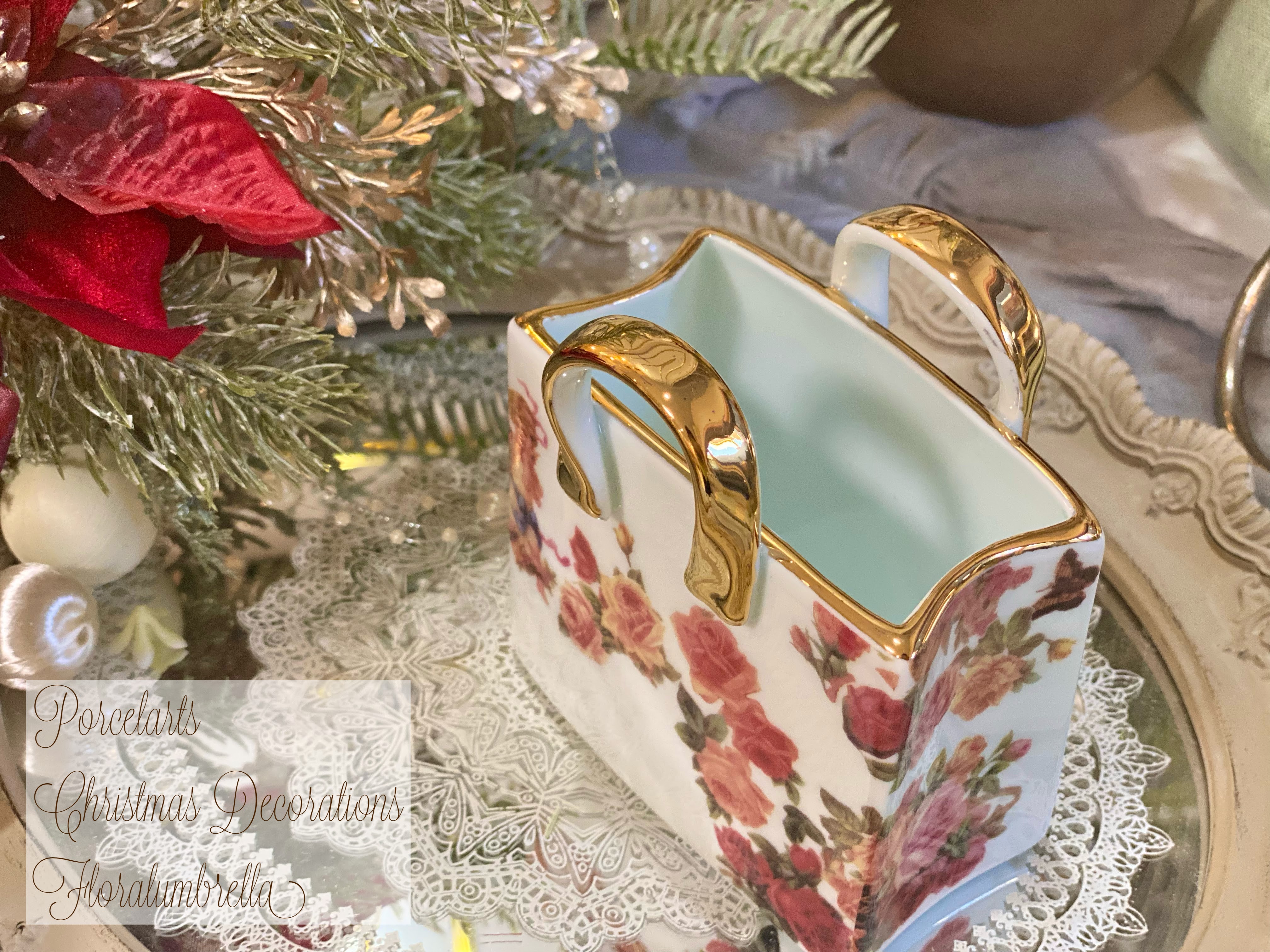 バッグにはクリスマス色のお花を飾って、 バスケットにはテーマカラーのレッドとゴールドのオーナメントを入れています。 金彩は代理で入れさせていただきました。 大体この2つで1レッスン(2時間)でお作り頂けます。 とっても可愛いクリスマス雑貨が出来ました♩ 結婚式の思い出として、ずっと大切にできるアイテムです。 それにしても、このシルエットの可愛いバスケット白磁。 お気に入りだったのですが、廃盤になってしまったんです。。残念です。泣