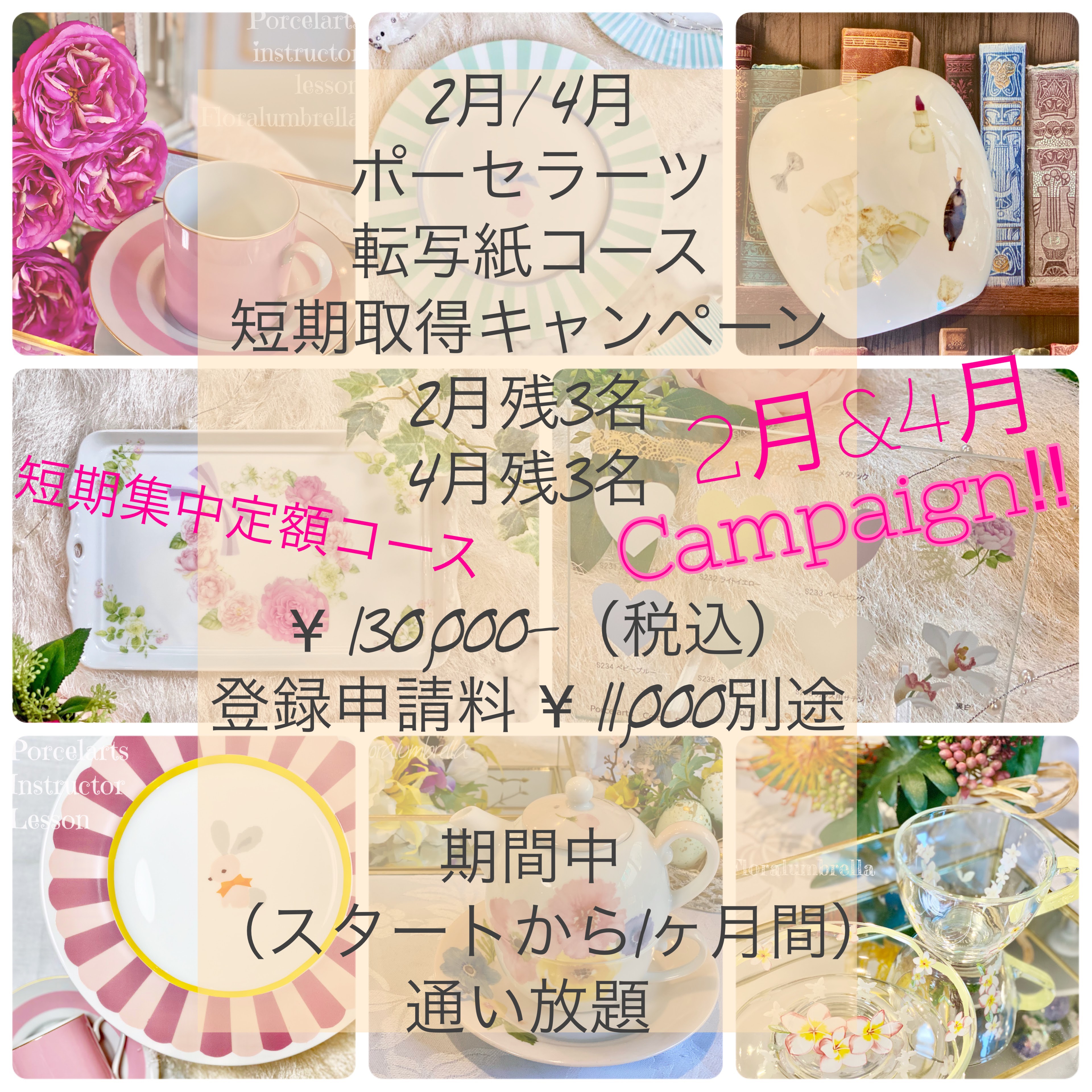 【2月4月限定‼️短期取得キャンペーン】 ポーセラーツの転写紙コースを短期で取得されたい方へ お得な定額キャンペーンのご案内です🕊💕 《募集期間:1/14(金)20:00〜1/23(日)24:00まで》 転写紙コースは、課題作品が10作品あります。 カリキュラムの課題制作にあたっては、規定の教材をご使用いただくことになっています。 その教材費が約¥86,000(税込)掛かります。 そこに、都度レッスン費(当アトリエは2時間3,300)や焼成費が掛かります。レッスンの数が増える程、資格取得に掛かる費用は上がります。 そこで、今回は短期で資格を取得されたい方に向けて、スタートから1ヶ月間通い放題の定額キャンペーンを行います😊♪ お値段は、¥ 130,000-(税込) 登録申請料 ¥ 11,000は、全10課題作品作成後に別途頂戴します。 ※レッスン費や焼成費は込みです。 ※スタートから1ヶ月が過ぎて全て修了しなかった場合には、1ヶ月過ぎたレッスンからレッスン費と焼成費をいただきます。 ※ご予約完了時に、大体のスケジュールを決めさせていただくことで、1ヶ月で終わるように調整させていただきます。 ※今回は転写紙コースのみのキャンペーンです。 転写紙コースを修了すると、ポーセラーツメンバーになることが可能です。 ポーセラーツメンバー ※焼成環境(電気炉の所有)の有無は問わず、メンバーの育成/技術指導ができます。 こんな方にオススメです👇 ⭕️グッと短期間で集中してポーセラーツを学びたい方 ⭕️まとまったお休みやお時間がある方 ⭕️新しいことを始めたい方 ⭕️妊娠中で自由な時間がある時に資格を取得したい方 ⭕️転職の間の有給休暇期間中の方 ご質問等ございましたら、DMまたはHPのお問い合わせよりお気軽にご連絡下さい📩☺️