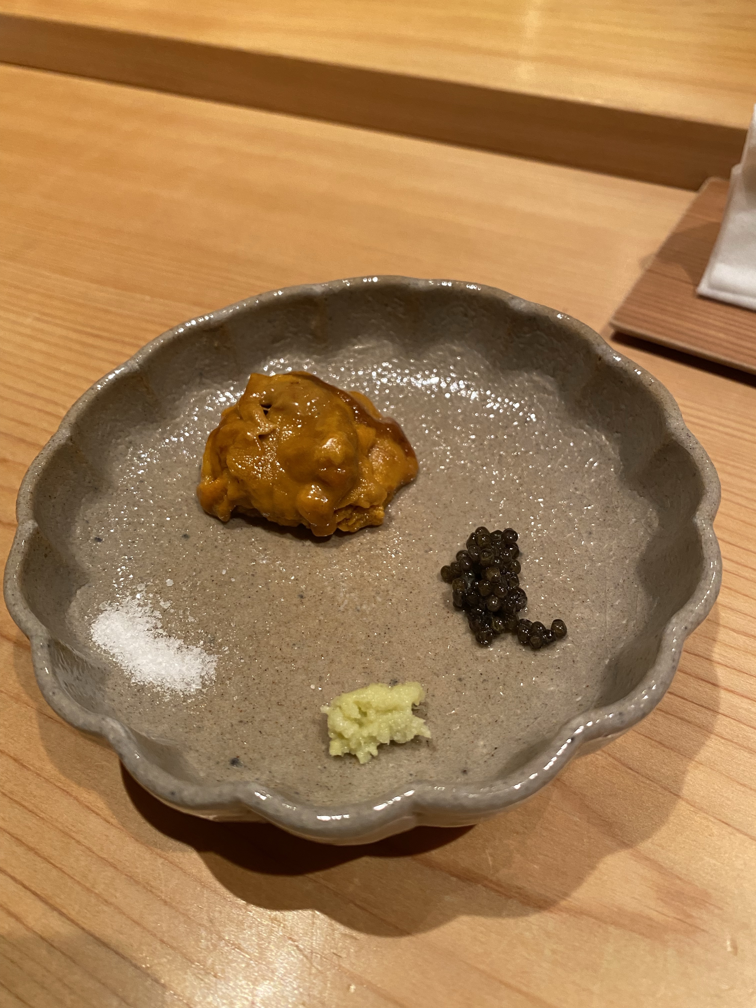 天草のこはだ。握りの方は根室のバフンウニ。 噛めば噛むほど旨味が広がるネタ。 ネタの温度なども変えて、酢飯との相性や口の中に入れた後の味わいまで計算されているそうです。