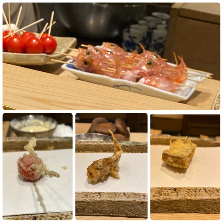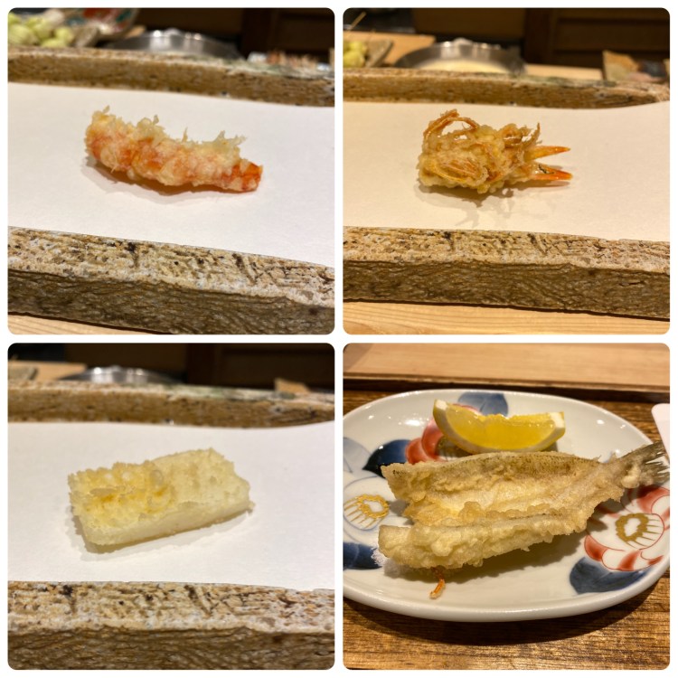 はじめの蕎麦の実とお吸い物はお写真撮り忘れてしまいました。 天ぷらは車エビ2匹から。それから車エビの頭。 頭部分にはお味噌が入っていて濃厚!