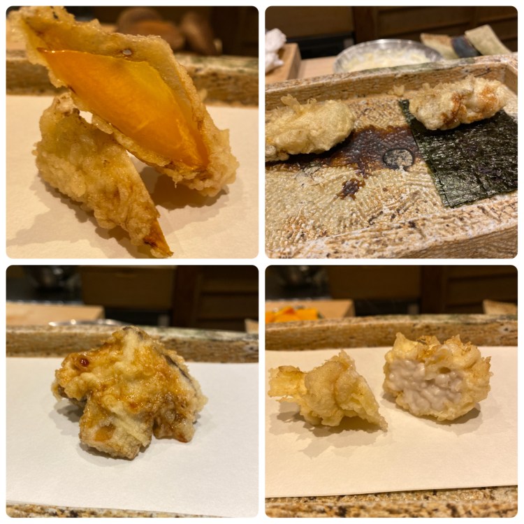 金美人参もフルーツトマトもめちゃくちゃ甘かった♡ お野菜の天ぷらって嬉しい。 牡蠣はそのままと海苔に巻く2パターン。