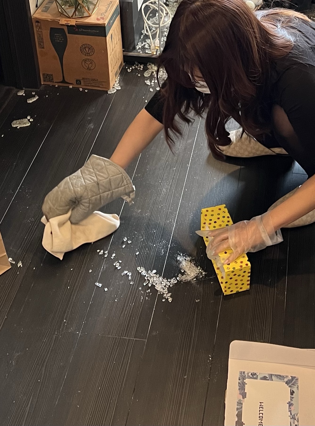 小さいころ、祖母の家で割れた食器の破片を踏んでから、1週間ほど痛いと思いつつ、皮膚の奥に入った破片を見つけられずに過ごした過去があり、割れたガラスに恐怖心を抱いている私。 とにかく早く片付けたい。家を安心できる場所に戻したい。という一心で片付け開始。 まず、玄関に来客用のスリッパがあったので、それを履いて部屋に入りました。 物が盗られている気配もなく、やはり自然に粉々になった模様。 捨てようと思っていた鍋掴みをはめて箱にかき集めながら片付けました。