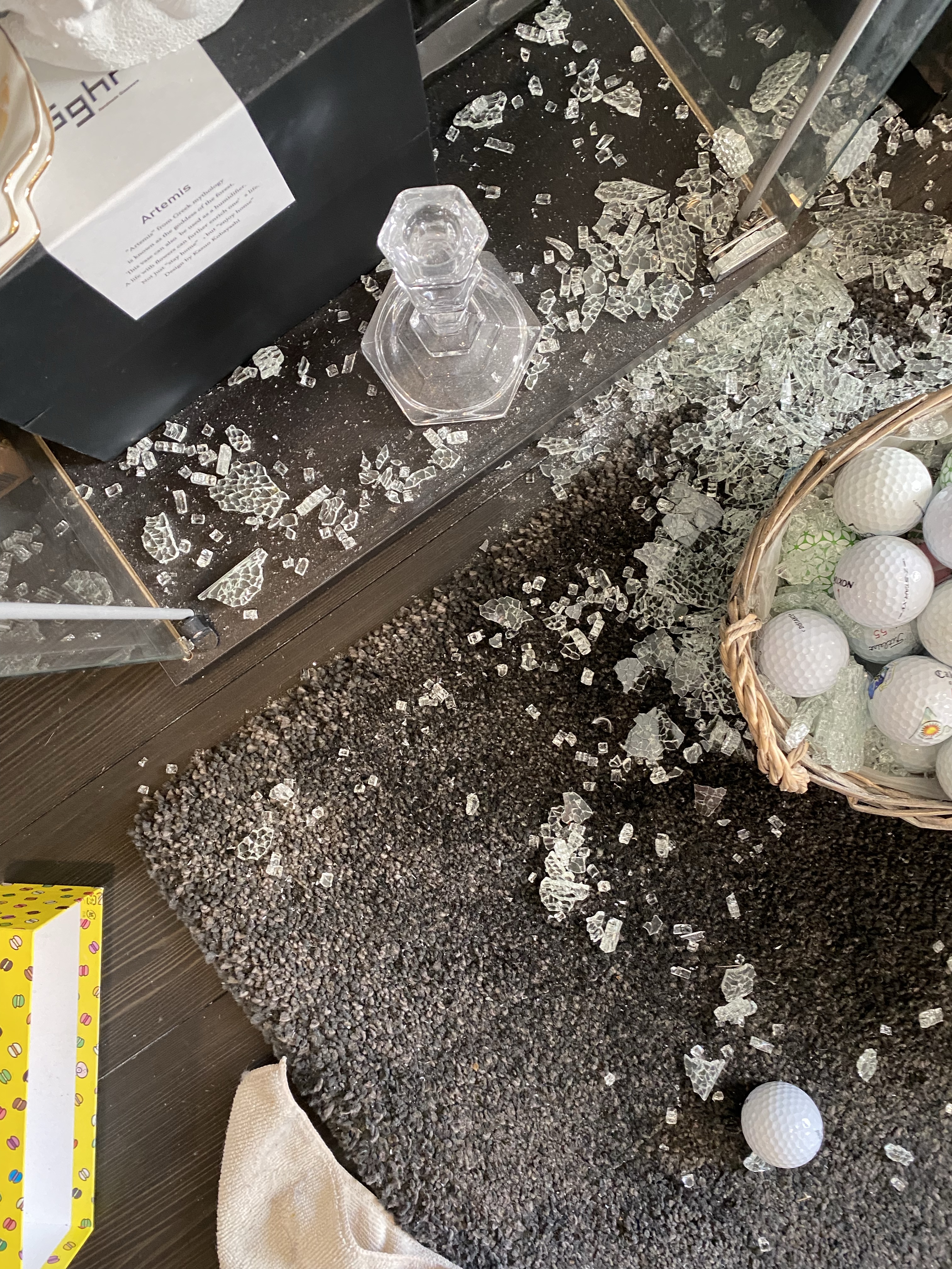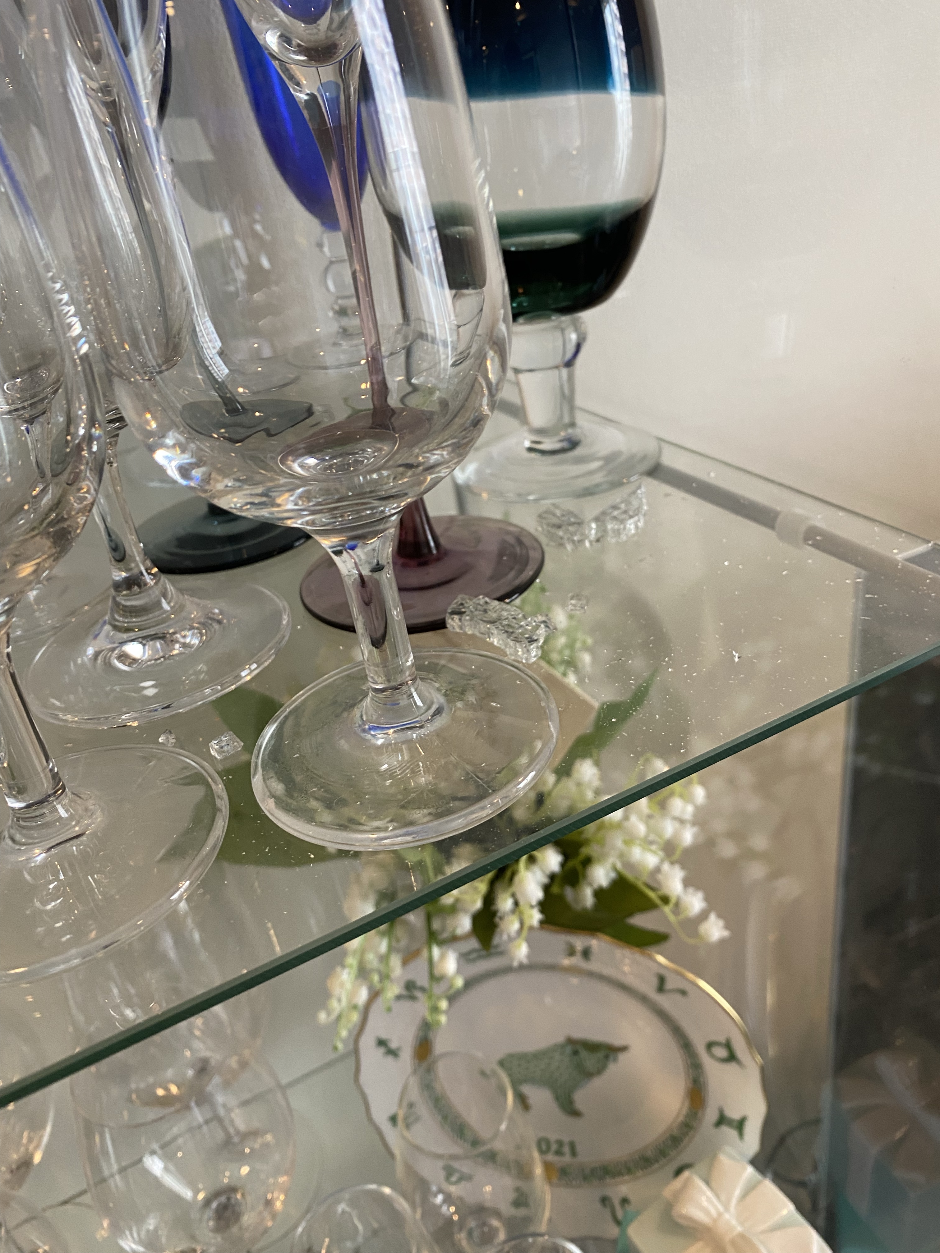 幸い、中のグラスは割れなかったけど、近くにあった花瓶は割れました。 グラスやヘレンドのイヤープレートが割れなくて本当に良かった!