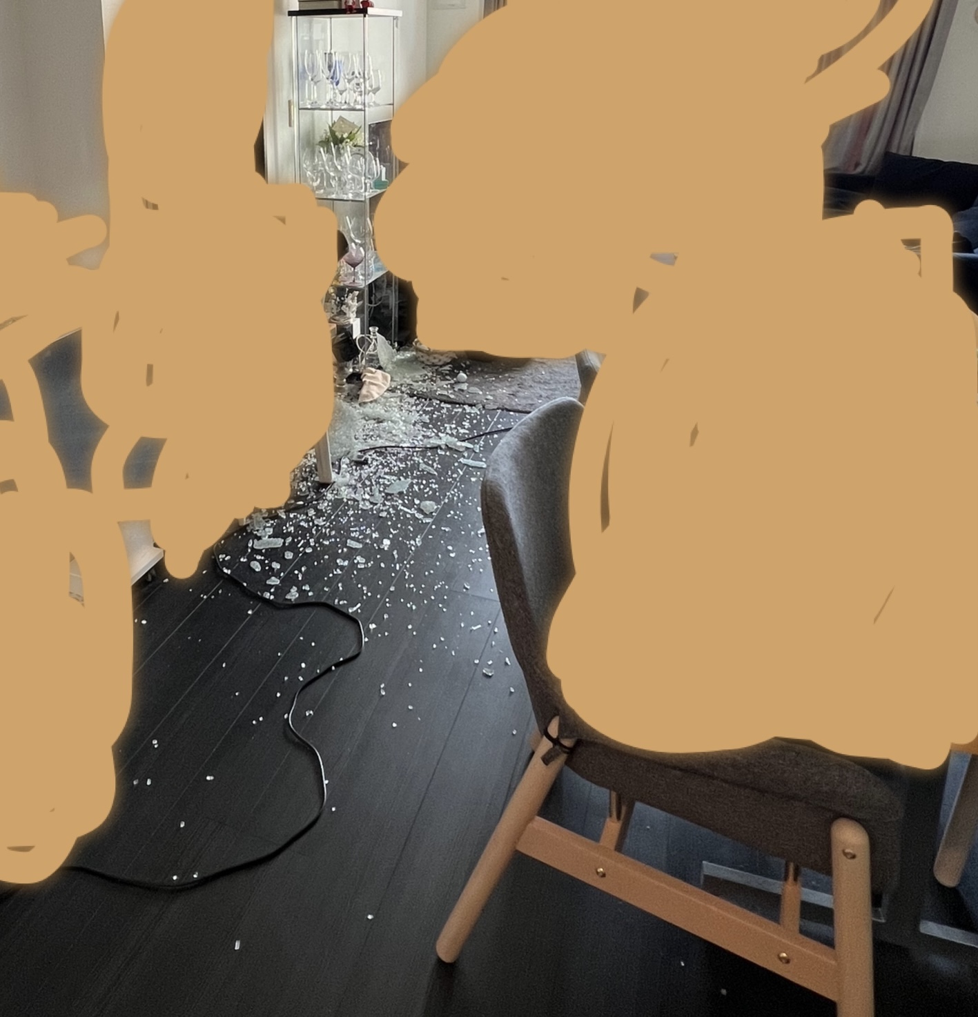 きっとしっかりされている方でしたら、ガラスの家具などには、ガラス飛散防止シートなどを貼られているかと思いますが、私は知識不足でそこまで考えが及んでおらず、悲惨な事態になりました。 夫が、私が1人で家にいるときに割れなくて良かった!と言ってくれたのですが、確かに幸いにも、誰もいない場所で割れたことで怪我もせず、させずに済んだのかと思っています。