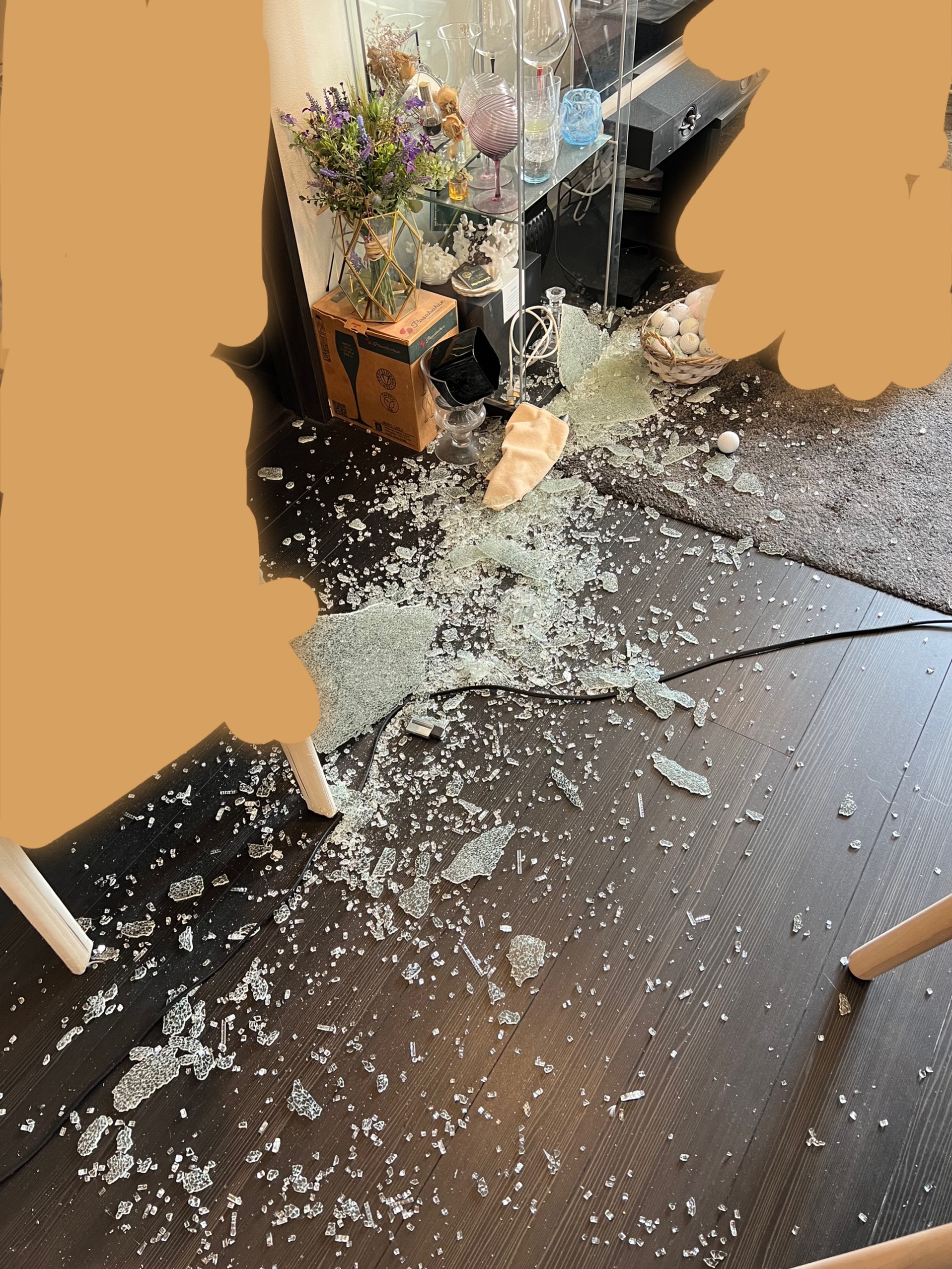 一瞬、何がばらまかれているのかよく分からず、空き巣?と不安になりました。 が、家の鍵は今開けたし、外から登ってこられるような階でもないので、「違うよね。」と判断。 よくよく見るとキャビネットの扉が粉々になっていました。