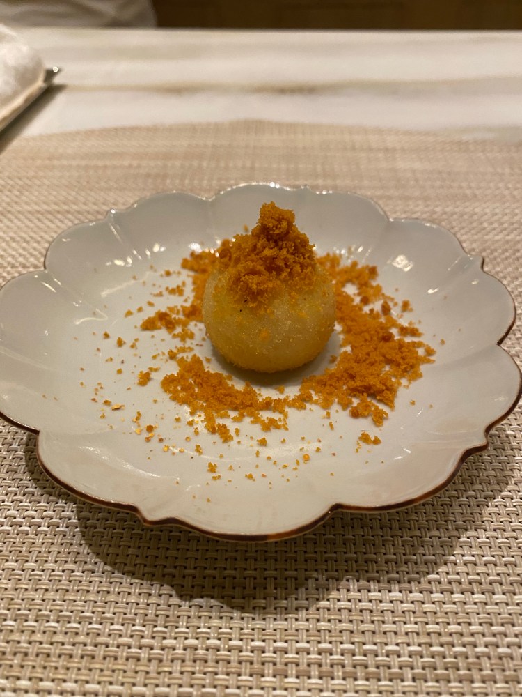 カラスミと里芋。里芋がねっとり美味しかった。 シャンパーニュにあいますよね。これ好き。