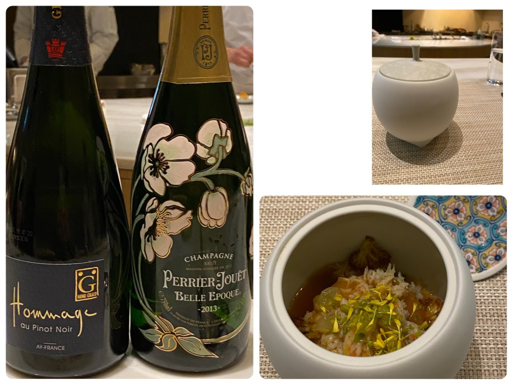 ドリンクは、通常より量少なめのハーフペアリングをお願いしました。 私がワインエキスパートの勉強を始めて合格してから、夫が「ペアリングにしたら?」とよく言ってくれます。優しい。 こちらは寒鰤。青大根にディルがアクセントになって好きな味。