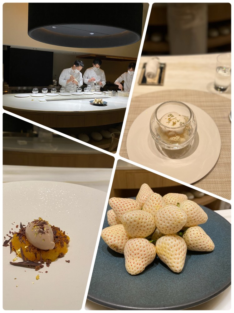デザートは、シェフパティシエの江藤 英樹さんが担当されています。 左下のアイスがのったデザートは、見た目がチョコレートだから構えていましたが、甘すぎずペロリ。いちごは爽やかな甘さでこれまたペロリ。 2種類どちらも好みでした♡