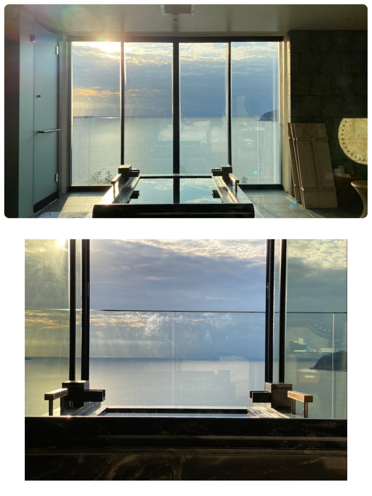 お部屋は全部で13部屋。ツイン、ダブルのお部屋に加え、160㎡以上を有する数寄屋造りの特別室が2部屋あるそうです。全てのお部屋から相模湾を望む、全室オーシャンビュー。さらに、お部屋には温泉風呂が付いており、熱海の名湯が楽しめます。