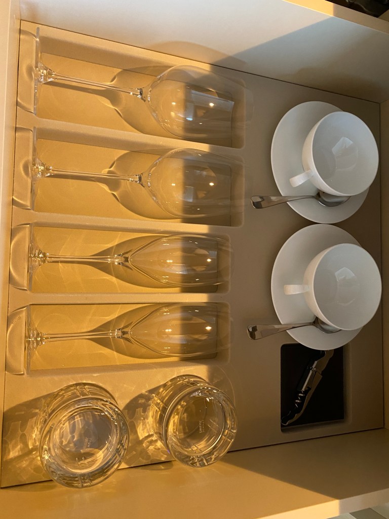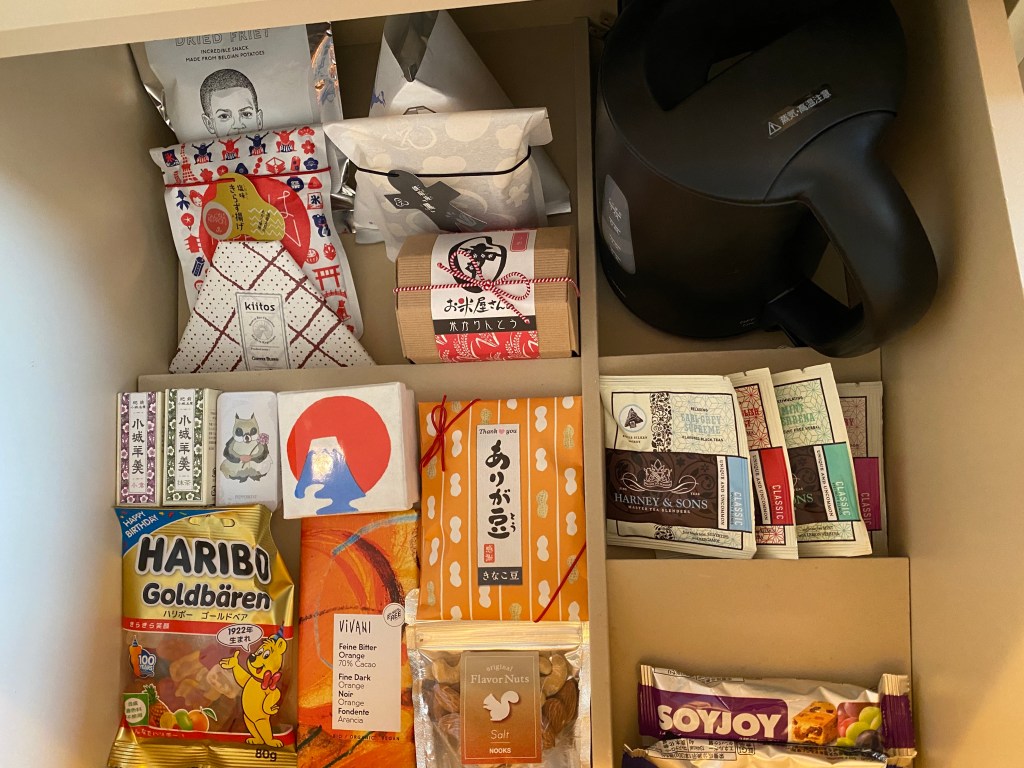 グラスやミニバー。(冷蔵庫の中は取り忘れました) 日本っぽいお菓子も。