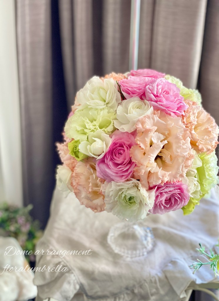 これは出来上がりなのですが、 作成途中で1度先生にヘデラベリーの緑が多すぎるって言われたんです。 最初は「なんでー?グリーン多いほうが体のボリューム出るしバランスが良い気がする」って思ってたんですが、直した後に言われた言葉でスッキリ腑に落ちたんです。 それが、「このピンクのラナンだったら装飾的に寄せた方がいい」って言葉だったんですよね。 最初に装飾的って言われていなかったから、植生的に作ってもいいかとは思うのですが、確かにこの色合わせとカタツムリに見立てるようなテーマなら装飾的が合うなぁと納得したんです。 私はカタツムリとバランスの事しか考えてなくて、造形のイメージを考えてなかったなぁって。 自然的・装飾的って、最初に自分でテーマを決めるだけではなく、与えられた花材とテーマから、どちらがより合うのかを考えて作り上げていくことも大切なんだと感じました。 10年以上フラワーデザインを学んでいますが、こうやって新たな気づきがあるのが楽しいし、勉強になるなぁと思いました。