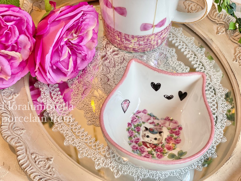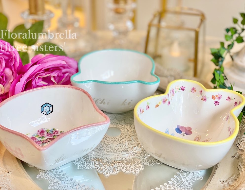 猫さん、クマさん、ウサギさんの形の白磁を使用していて、それぞれにお名前入り! ポーセラーツギフトのオススメポイントは、お名前やイニシャルを入れられることですね。それだけで特別感が出ます。