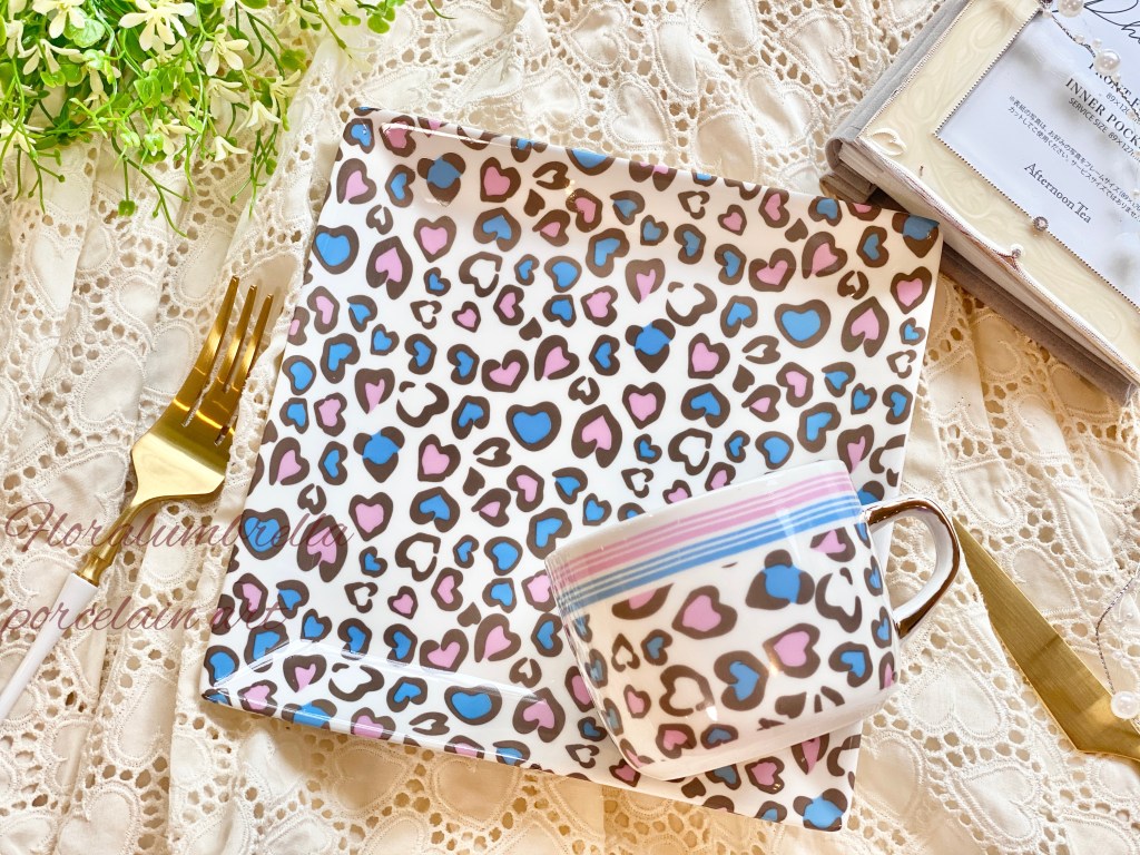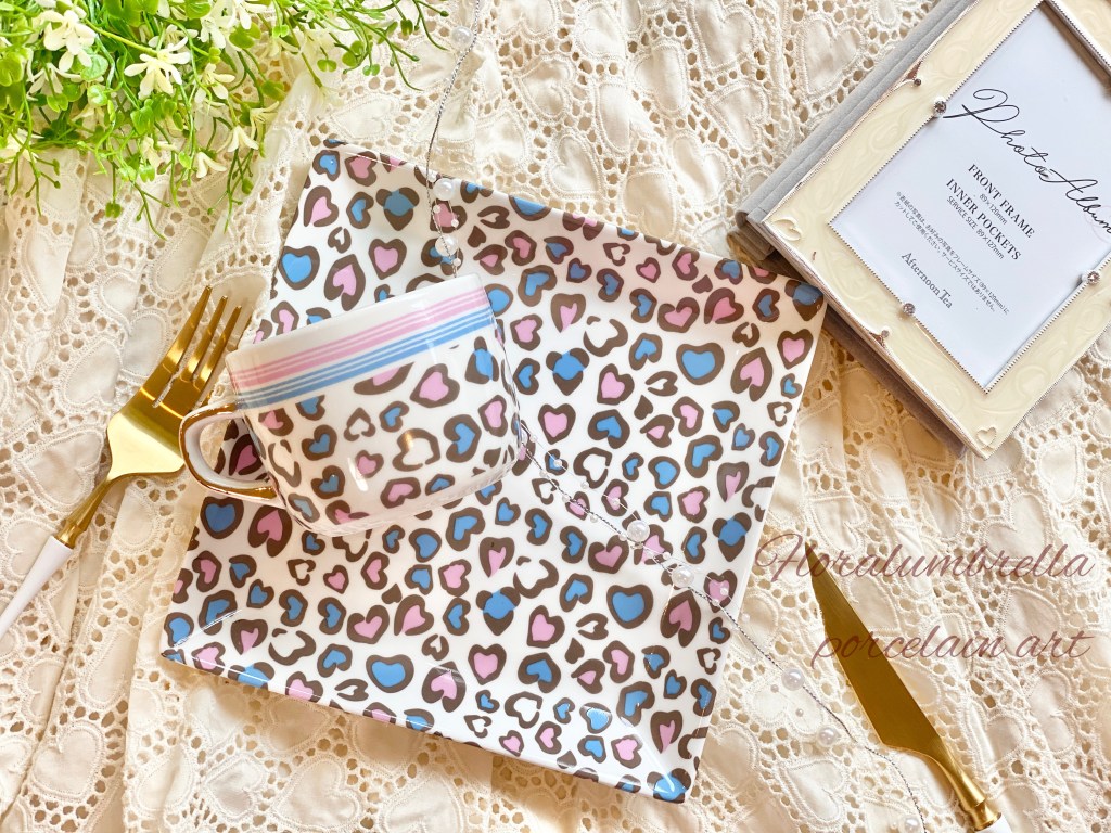 大き目のスクエアプレートに転写紙の全面張りでポップなデザイン! トーストやクロワッサンをのせて、スープなどをカップに入れてモーニングプレートにしても素敵です♡